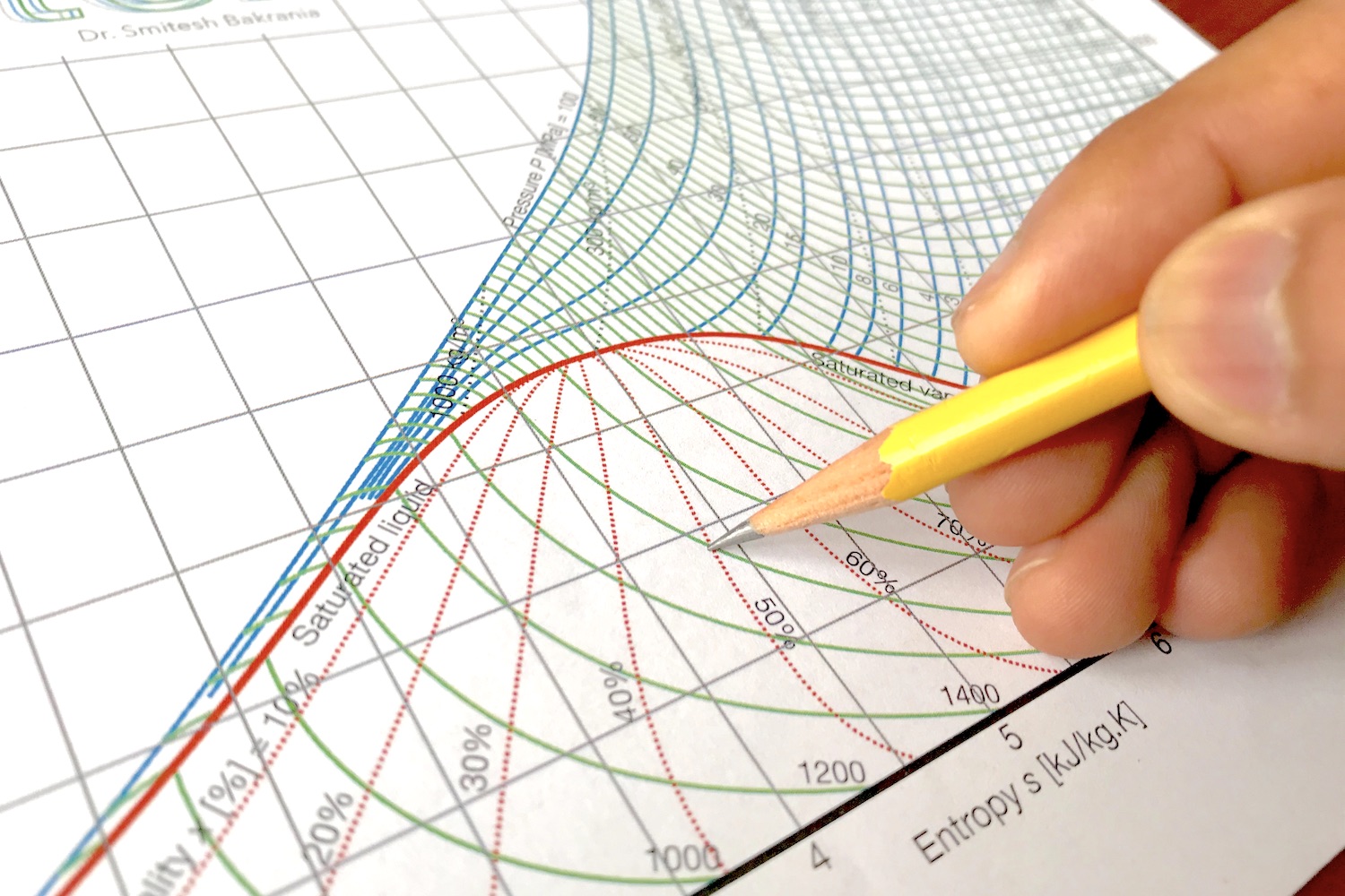 This web-based interactive T-s chart was an early iteration developed by a Rowan Mechanical engineering student, Christopher Ferry, as part of his independent study. This chart provides thermodynamic properties of water simply by gliding your cursor over the chart. It is best viewed on a desktop browser. This approach was limited by the inibility to read properties in between the provided lines.